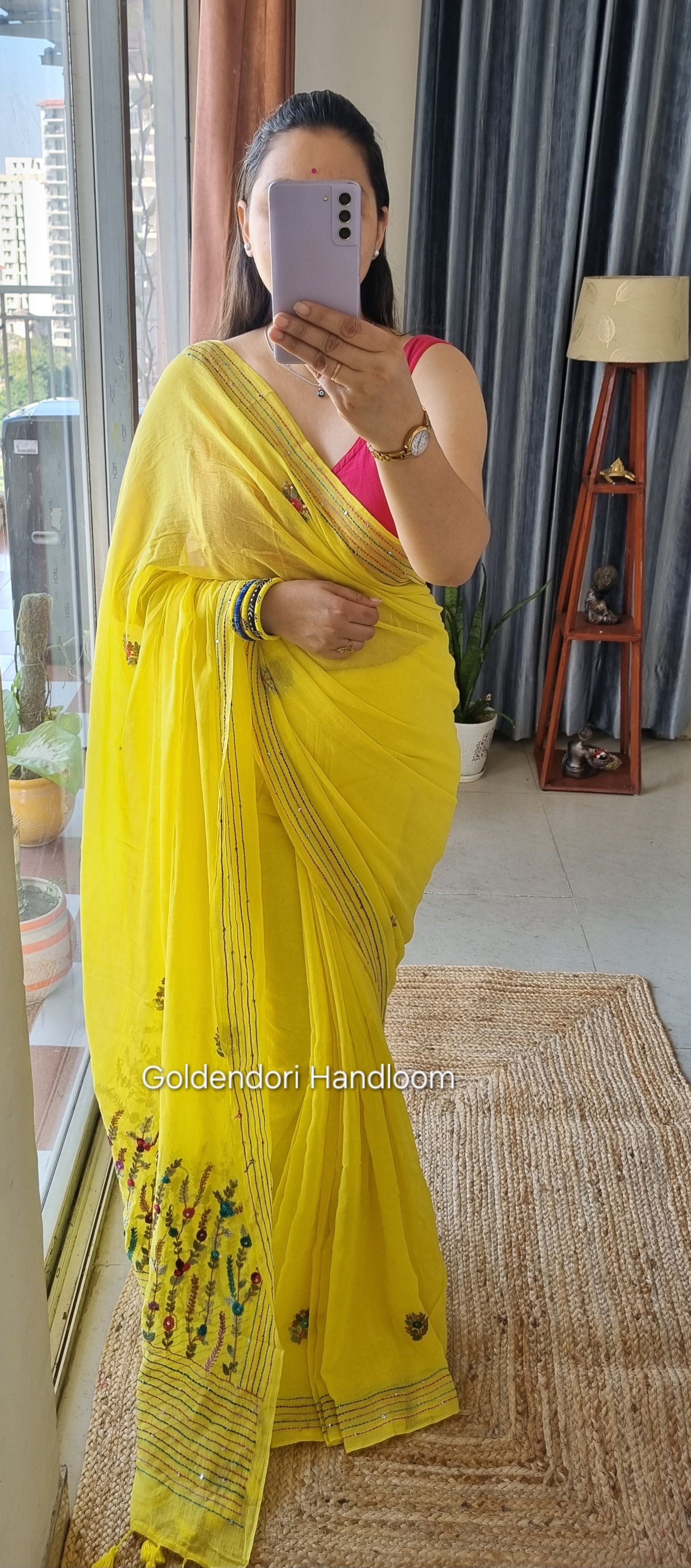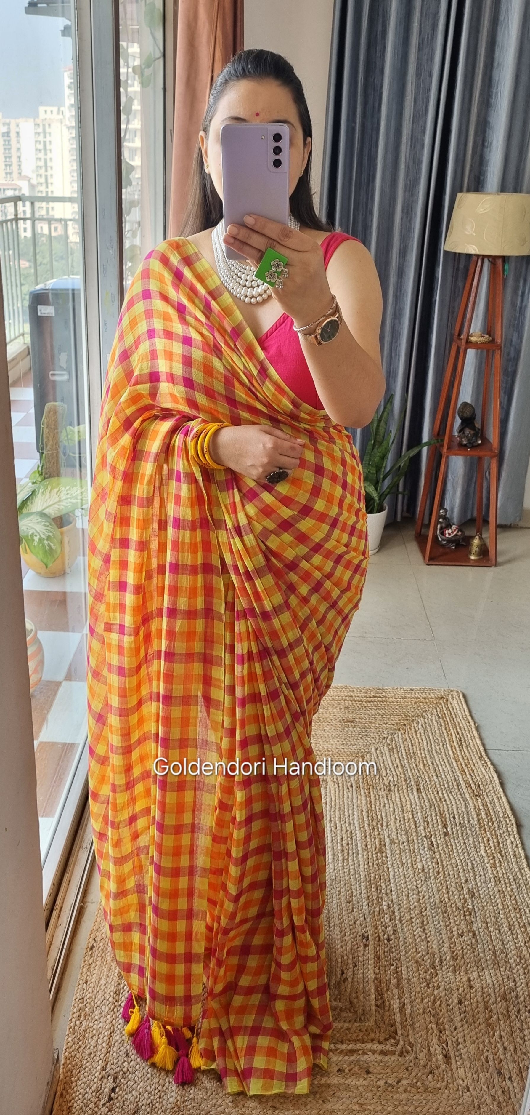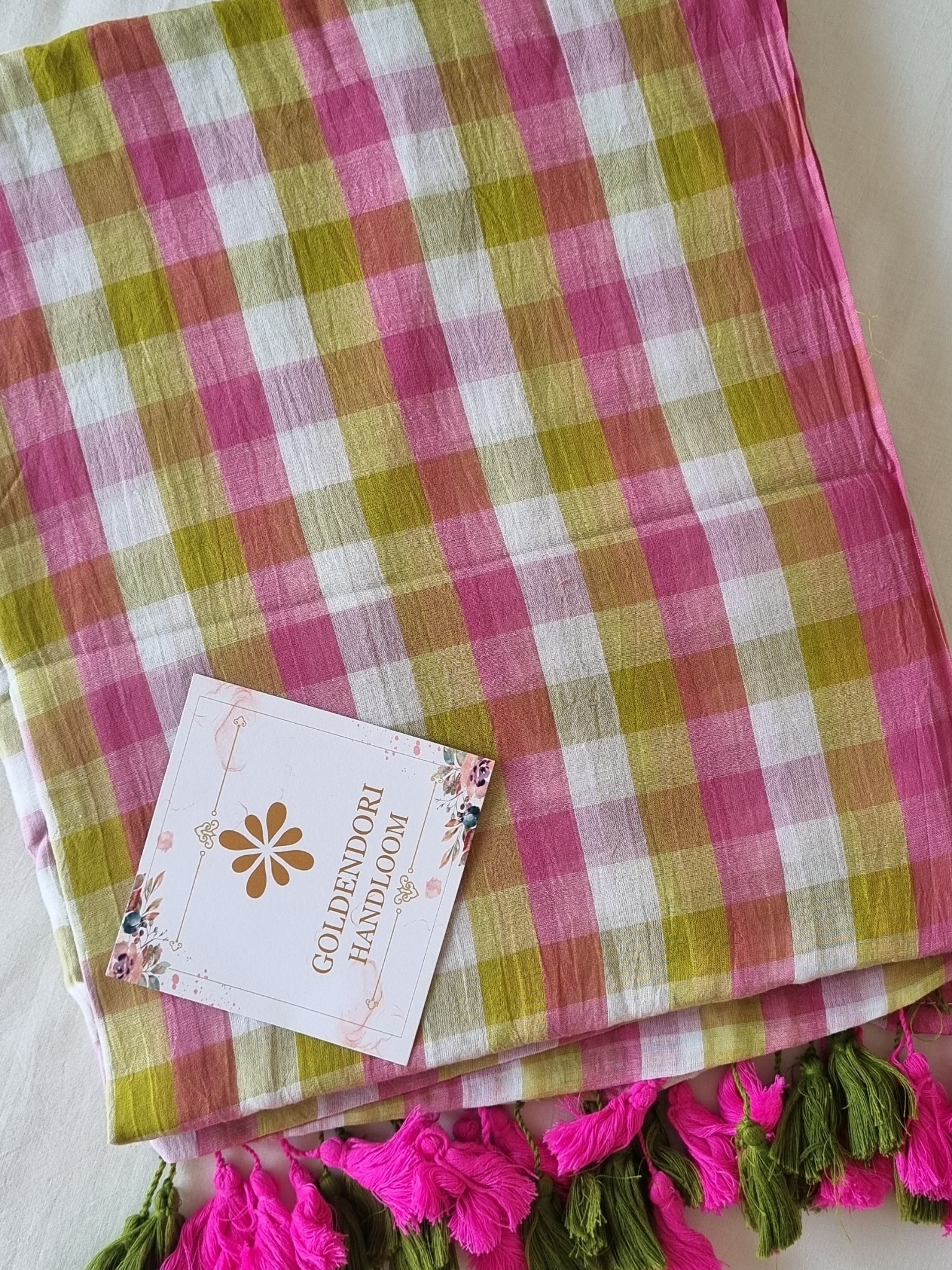 Yellow Pink Cheks Pure Mul Cotton Saree