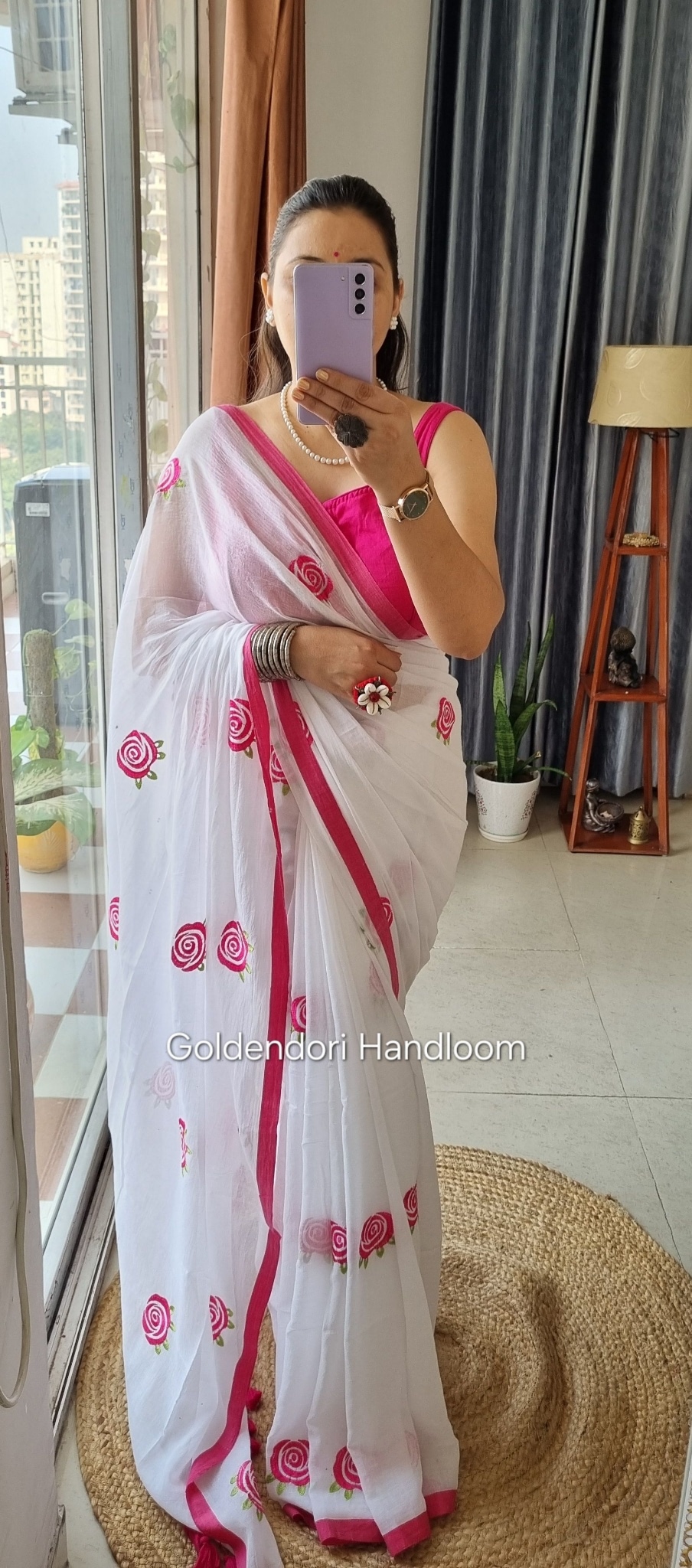 ROSE White Pure Mul Cotton Saree