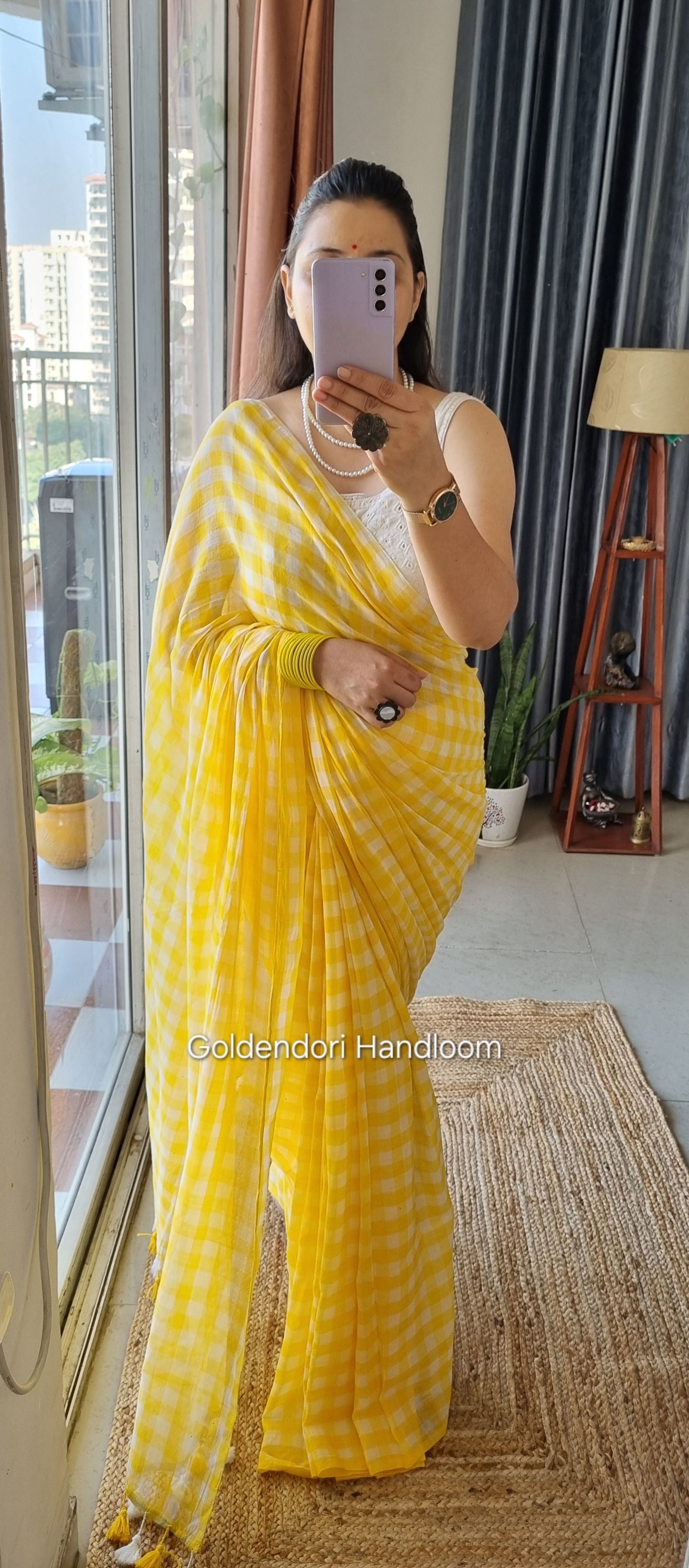 Yellow Checks Pure Mul Cotton Saree